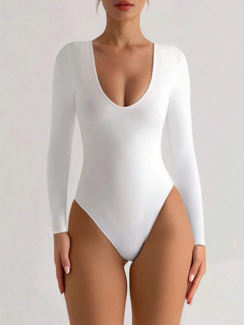 Frisca White Deep Neck Full Sleeves Bodysuit