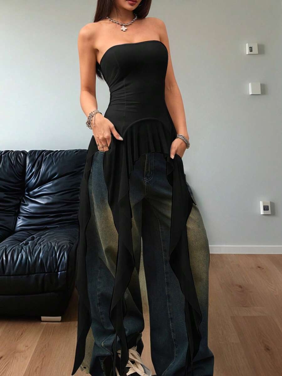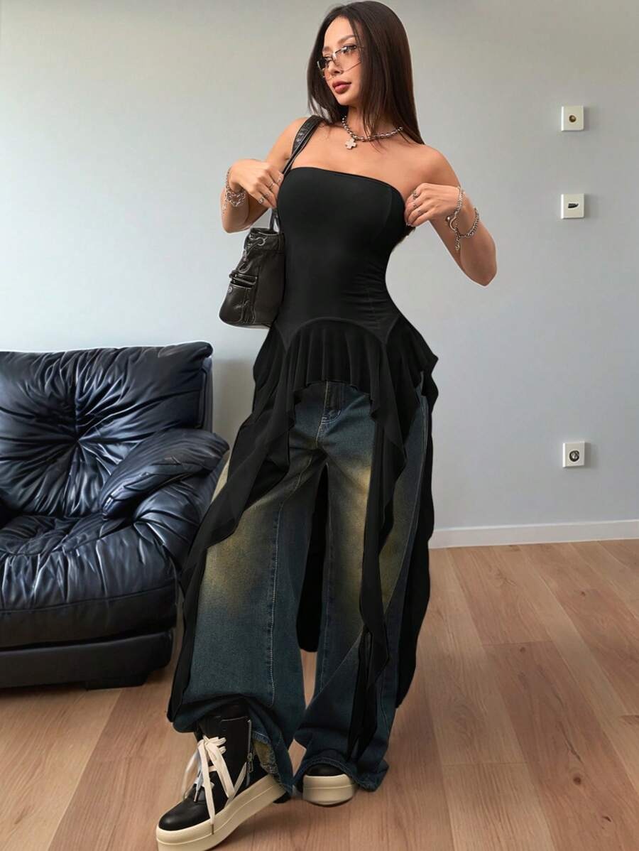 Olivia Black Off Shoulder Flared Mesh Top